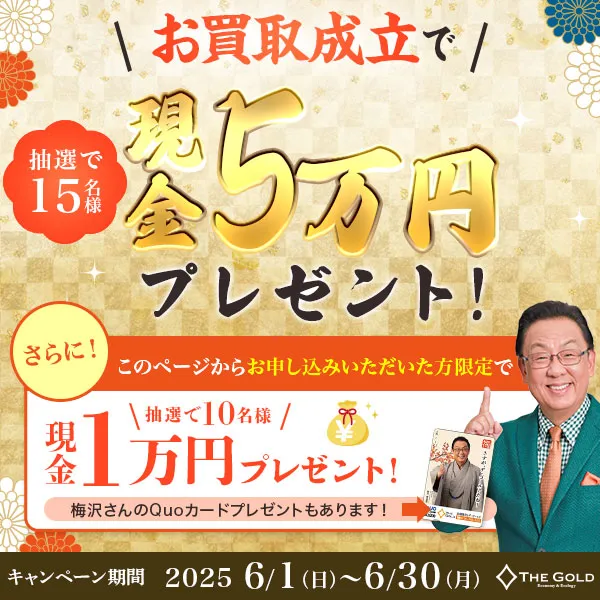 今ならなんと、6月30日までに出張査定依頼をすると抽選で15名様に現金5万円が当たるキャンペーン実施中です!さらに、下記ボタン(公式サイト)からのお電話orフォームから査定を申し込むと、10名様限定で現金1万円プレゼントがありますよ!