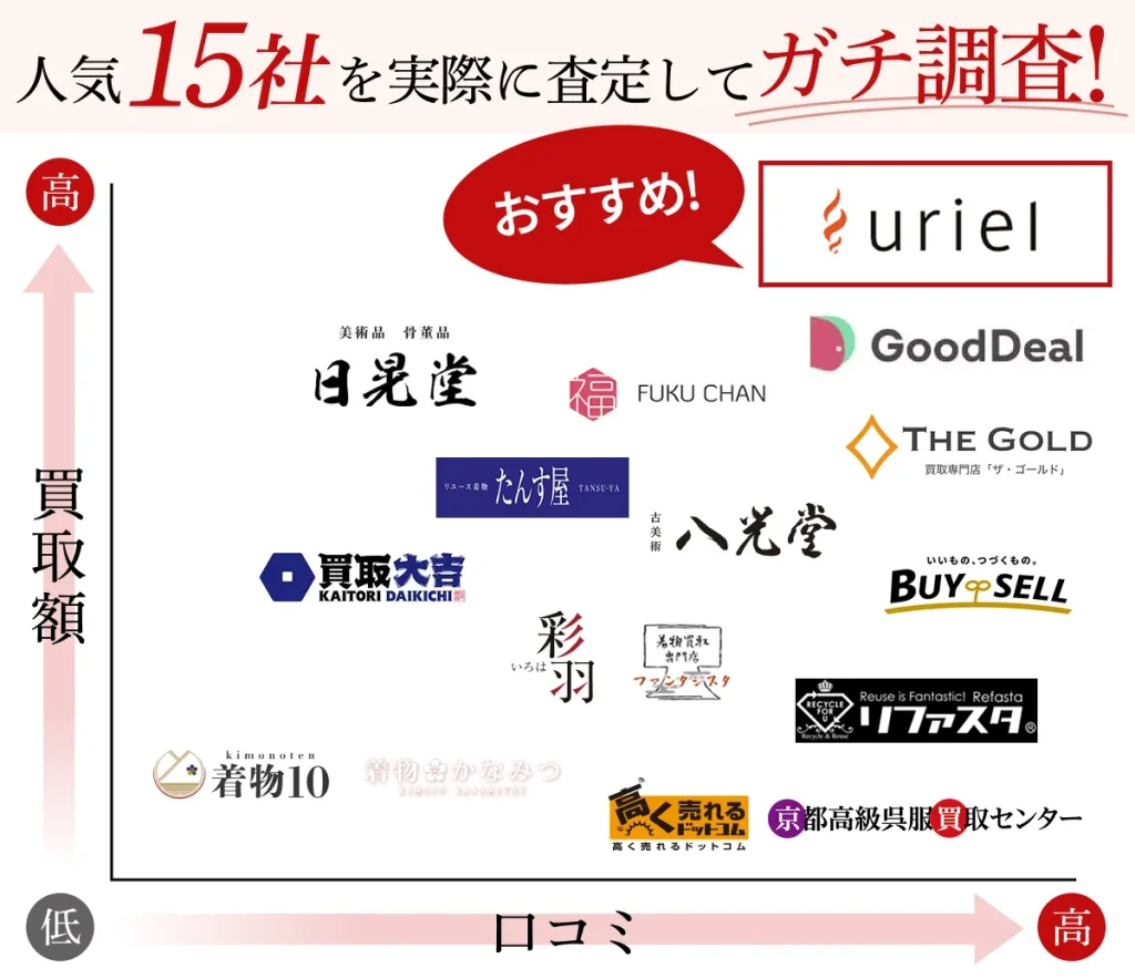 特に、ウリエルは相場以上の買取、全国対応、圧倒的口コミの良さの条件を満たしているので、初めて着物を査定してみる方に特におすすめです!