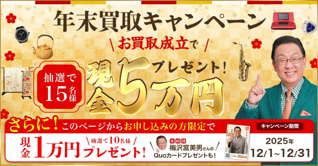 今ならなんと、12月28日までに出張査定依頼をすると、国産米2kgをもれなく全員にプレゼント!さらに、現金5万円が抽選15名様に当たる特別キャンペーン実施中です(~12/31まで)!