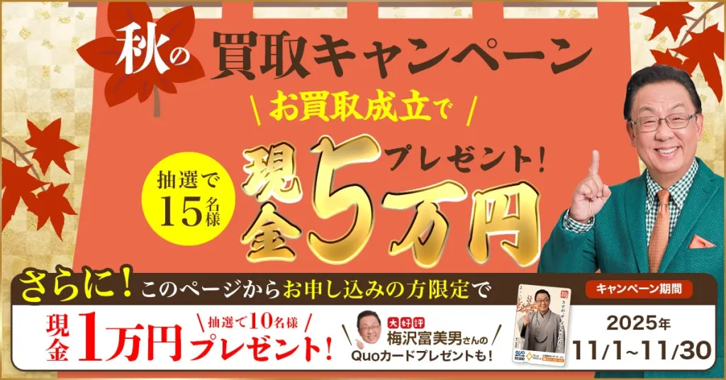 今ならなんと、11月30日までに出張査定依頼をすると、国産米2kgをもれなく全員にプレゼント!さらに、現金5万円が抽選15名様に当たる特別キャンペーン実施中です!